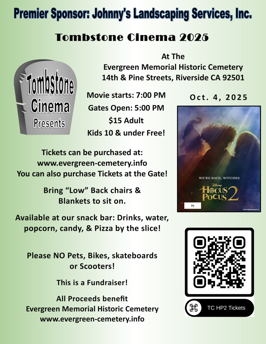 Hocus Pocus 2 – Tombstone Cinema By admin on September 13, 2023 in October 4, 2025 7:00pmPaid EventPrice: $15Buy Tickets Movie rated “PG” Part of the Tombstone Cinema Movie Series Time Line for Saturday, October 4, 2025 5:00 PM Gates open for Movie entrance 7:00 PM Movie “Hocus Pocus 2” Starts
